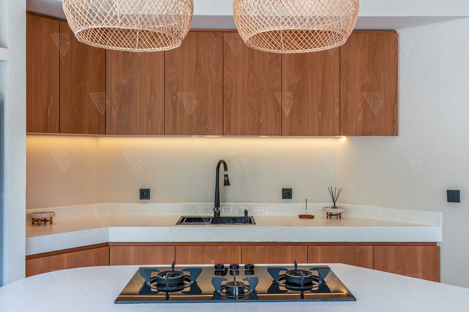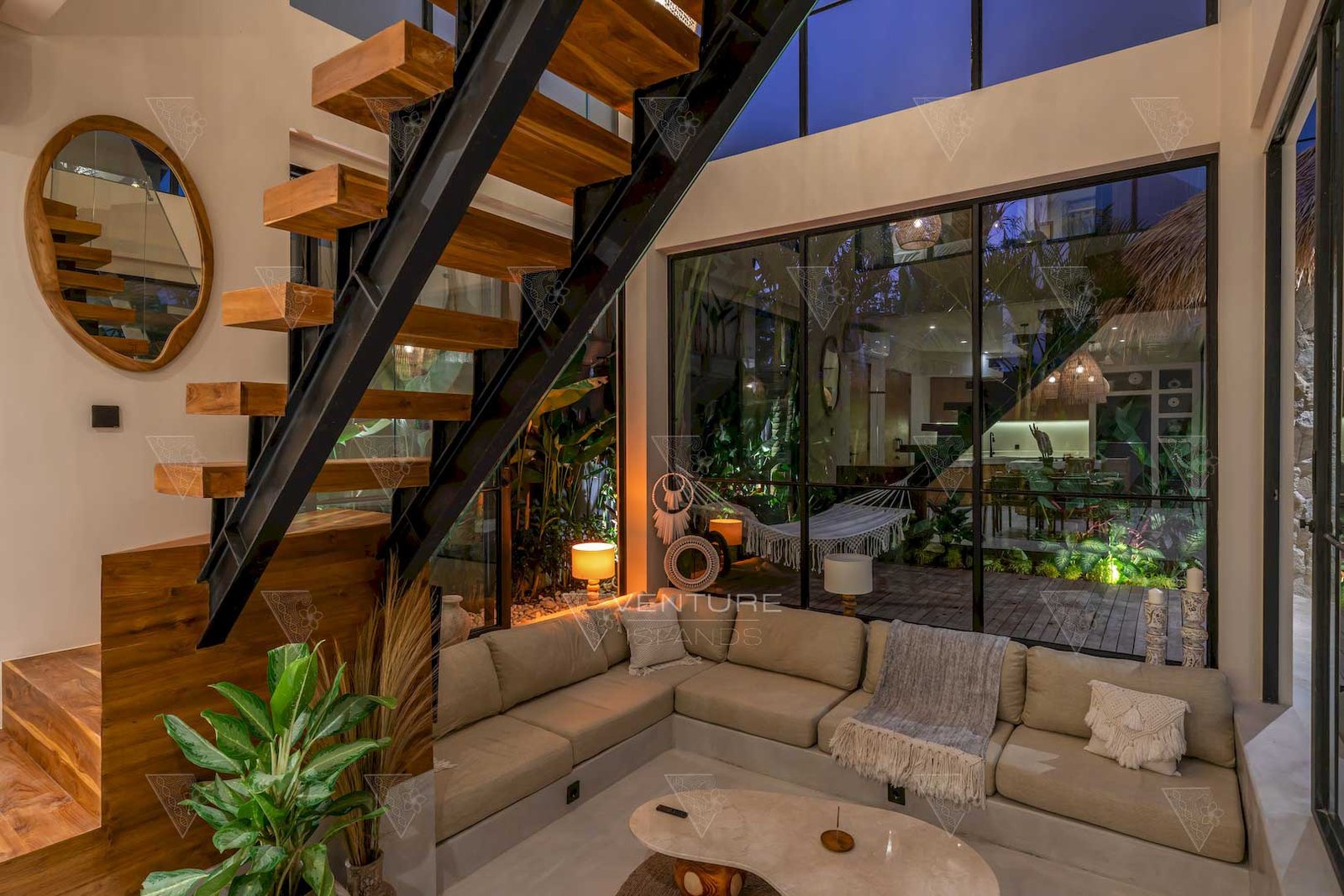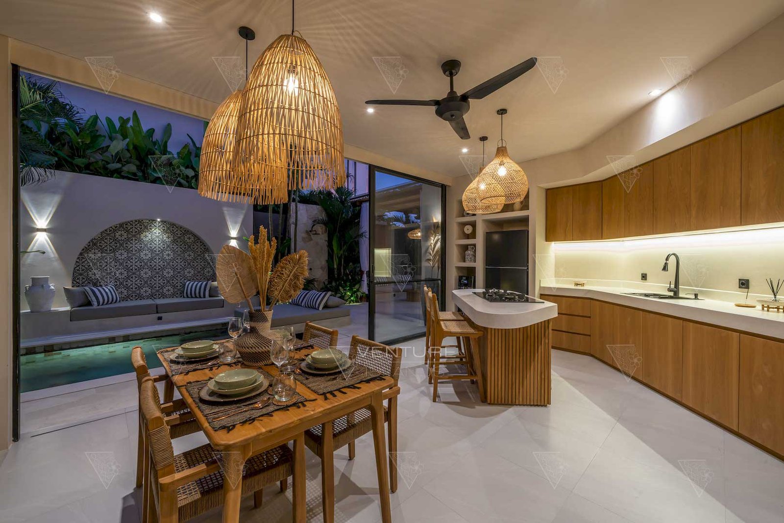 - Open-plan kitchen, dining, and sunken living area