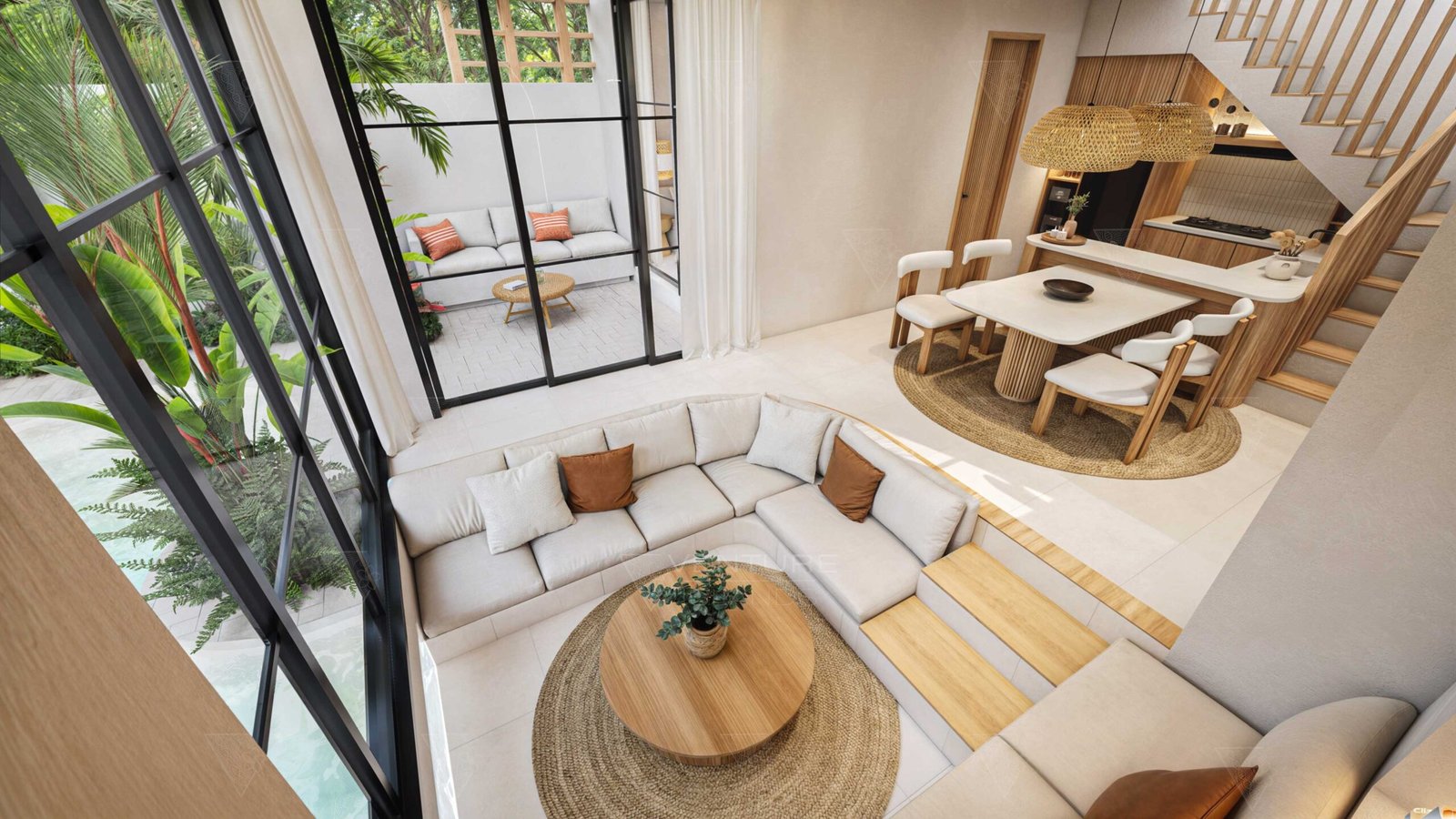 A refined two-bedroom villa in Uluwatu, designed with a modern tropical aesthetic and a well-balanced layout across 100 m² of land and 112 m² of build. The villa features two private en-suite bedrooms on the upper floor, with a sunken lounge and fully equipped kitchen forming the heart of the ground level.